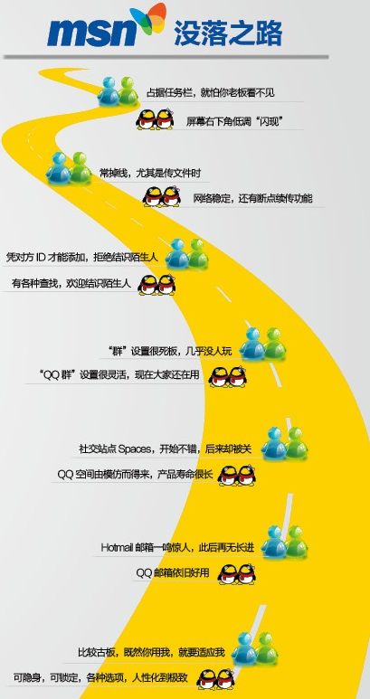 這(zhè)些都是用(yòng)戶體驗的(de)細節,但它們讓MSN慢(màn)慢(màn)地喪失了(le)白領用(yòng)戶群體。白領本來(lái)是非常頂MSN的(de),因爲大(dà)家都覺得(de)QQ屬于學生用(yòng)的(de)東西。我覺得(de),從戰略的(de)思路來(lái)講,MSN比QQ更清晰。它通(tōng)過IM工具開始,慢(màn)慢(màn)加上一些社交屬性,比如加上Spaces。最後卻是QQ赢了(le),這(zhè)多(duō)多(duō)少少有運氣的(de)成份在裏面,它本身的(de)規劃包括整個(gè)産品脈絡上并沒有顯得(de)多(duō)麽地前瞻性。