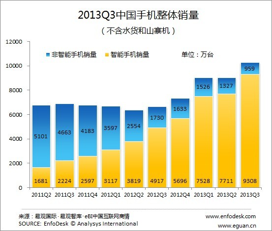根據Enfodesk易觀智庫最新發布的(de)《2013年第3季度中國手機市場(chǎng)監測報告》顯示,3季度中國手機(不含水(shuǐ)貨和(hé)山寨機)銷量爲10266萬台,環比增長(cháng)13.6%,同比增長(cháng)54.5%。其中,智能手機銷量爲9308萬台,環比增長(cháng)率爲20.7%,同比增幅更是高(gāo)達89.3%。智能手機占整體市場(chǎng)份額持續上升至90.7%。