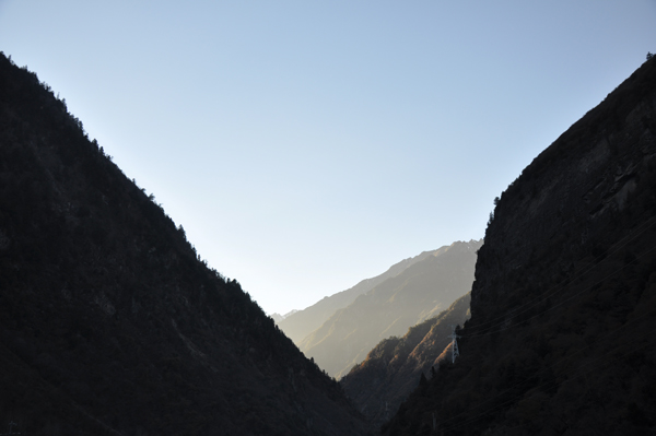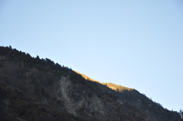 驅車到達畢棚溝溝口,群山在夕陽的(de)餘晖下(xià),顯得(de)甚是美(měi)麗。