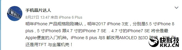 此外,消息人(rén)士還(hái)強調,2017年的(de)iPhone将有三款,一個(gè)是5.5寸的(de)iPhone 8 Plus,一個(gè)是5寸iPhone 8,至于4.7寸的(de)iPhone SE将成爲蘋果便宜的(de)入門機型,其會使用(yòng)TFT材質屏幕和(hé)金屬外殼,而iPhone 8系列将是AMOLED屏幕,機身爲雙面3D玻璃。