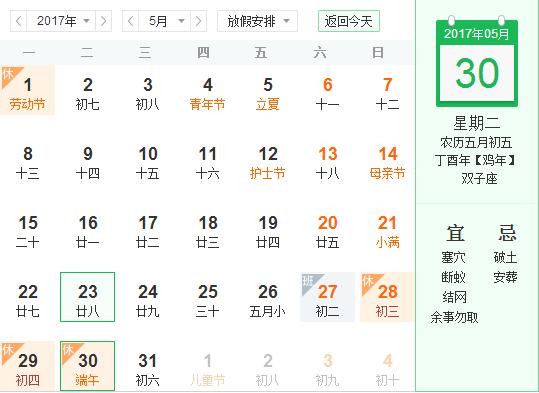 5月(yuè)28日-5月(yuè)30日,上班時(shí)間爲5月(yuè)27日(周六)。