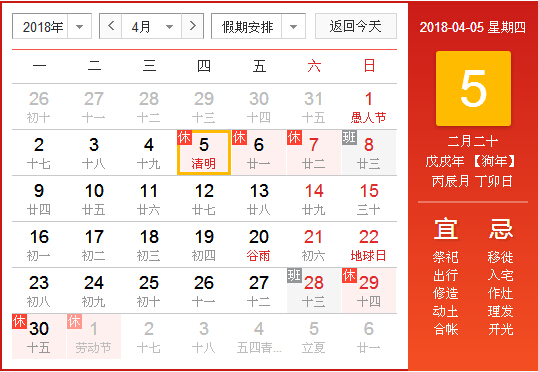 2018年4月(yuè)5日(星期四,清明(míng)節)至7日放假調休,共3天