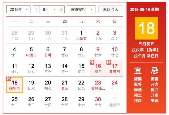 6月(yuè)18日(星期一,農曆端午節當日)爲國家法定節假日。