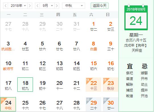 2018年9月(yuè)22日至9月(yuè)24日放假,共3天。