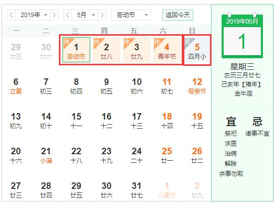 2019年5月(yuè)1日(星期三)至2019年5月(yuè)4日(星期六)放假,共4天;