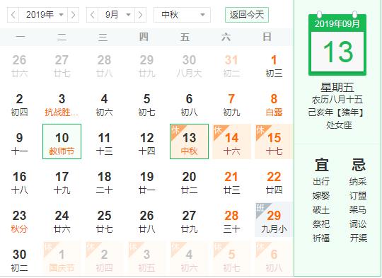 2019年9月(yuè)13日(星期五)至2019年9月(yuè)15日(星期日)放假,共3天.