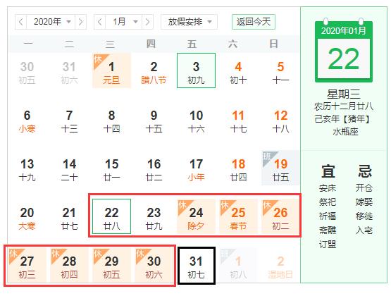 2020年1月(yuè)22日(星期三)至2020年1月(yuè)30日(星期四)放假,共9天;2020年1月(yuè)31日(星期五)上班。
