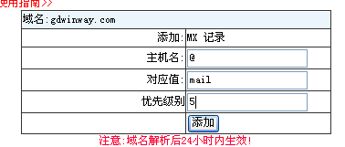 7.在主機名處輸入@,在對(duì)應值處輸入剛才添加的(de)别名mail,優先級可(kě)輸入5-50之間的(de)任意一數字,這(zhè)兒(ér)輸入5,最後點擊"添加",則整個(gè)域名的(de)MX解析過程就完成了(le),其它地方注冊的(de)域名解析方式也(yě)大(dà)同小異,不清楚之處可(kě)緻電我司技術部咨詢,也(yě)可(kě)以向願域名注冊商求助.(完)