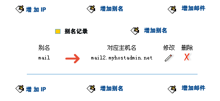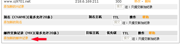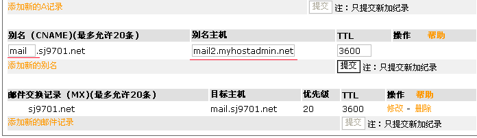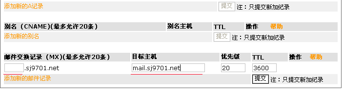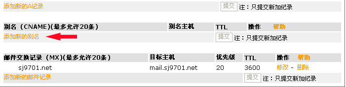 5.輸入完成後點擊提交,再點擊"添加新的(de)别名"以便設置此域名MX最終對(duì)應的(de)主機.過程如下(xià):