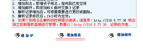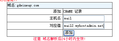 6.點擊"添加新的(de)别名"後在第一個(gè)輸入框輸入主機名"mail",在第二個(gè)輸入框"别名主機"處輸入郵局的(de)域名(在業務管理(lǐ)-郵局管理(lǐ)處可(kě)以查到)