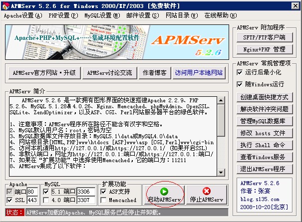 APMServ 5.2.6 是一款擁有圖形界面的(de)快(kuài)速搭建Apache 2.2.9、PHP 5.2.6、MySQL 5.1.28&4.0.26、Nginx 0.7.19、Memcached 1.2.4、phpMyAdmin 2.11.9.2、OpenSSL、SQLite、ZendOptimizer,以及ASP、CGI、Perl網站服務器平台的(de)綠色軟件。無需安裝,具有靈活的(de)移動性,将其拷貝到其它目錄、分(fēn)區(qū)或别的(de)電腦(nǎo)時(shí),均隻需點擊APMServ.exe中的(de)啓動按鈕,即可(kě)自動進行相關設置,将Apache和(hé)MySQL安裝爲系統服務并啓動。APMServ集合了(le)Apache穩定安全的(de)優點,并擁有跟IIS一樣便捷的(de)圖形管理(lǐ)界面,同時(shí)支持MySQL 5.0 & 4.0兩個(gè)版本,虛拟主機、虛拟目錄、端口更改、SMTP、上傳大(dà)小限制、自動全局變量、SSL證書(shū)制作、緩存性能優化(huà)等設置,隻需鼠标一點即可(kě)完成。