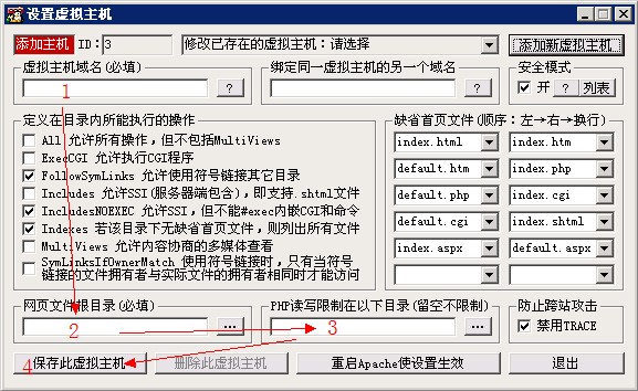 保存好虛拟主機後,要點擊“重啓Apache使設置生效”,新的(de)站點才會生效。