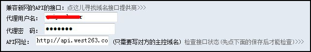 這(zhè)裏要求輸入代理(lǐ)用(yòng)戶名、代理(lǐ)密碼以及API網址。代理(lǐ)用(yòng)戶名和(hé)密碼參見說明(míng)文檔開頭設置的(de)密碼。API網址填寫:http://api.west263.com。如圖: