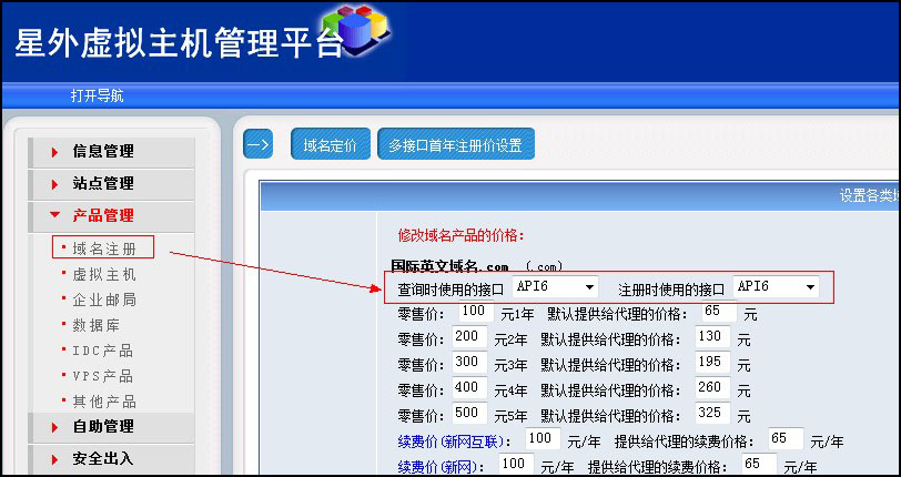 然後點擊“産品管理(lǐ)”——“域名注冊”,将右側的(de)所有域名查詢接口和(hé)注冊接口都選擇“API6”,如圖: