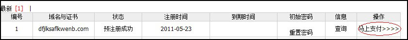 系統會提示“預注冊成功,馬上付費>>>”,點擊後系統會轉到域名管理(lǐ)列表,您剛注冊的(de)域名會提示“預注冊成功”,點擊最右側的(de)“馬上支付>>>>” 就正式注冊成功了(le),如圖: