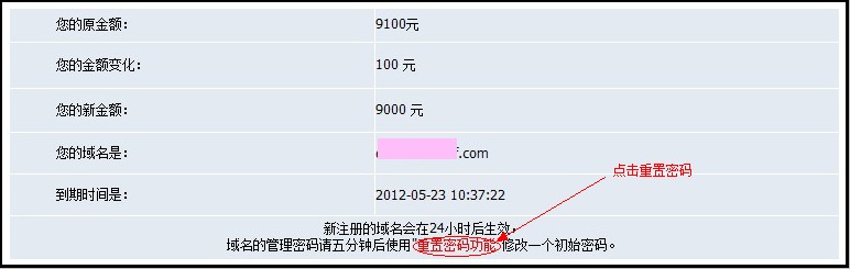 系統會提示您的(de)域名到期時(shí)間和(hé)重置密碼的(de)提示:新注冊的(de)域名會在24小時(shí)後生效,域名的(de)管理(lǐ)密碼請五分(fēn)鐘(zhōng)後使用(yòng)"重置密碼功能"修改一個(gè)初始密碼。點擊“重置密碼功能”,如圖: