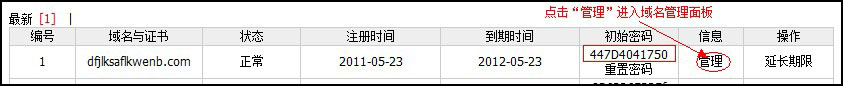 重置密碼後,會顯示一個(gè)初始密碼,點擊右側的(de)“管理(lǐ)”就可(kě)以登陸域名管理(lǐ)面闆了(le)。如圖: