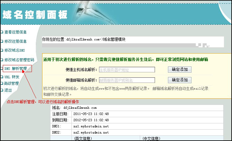 域名管理(lǐ)面闆界面,點擊"DNS解析管理(lǐ)"可(kě)以進行域名解析。如圖: