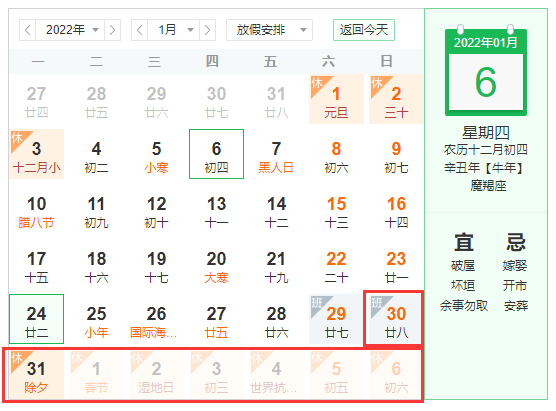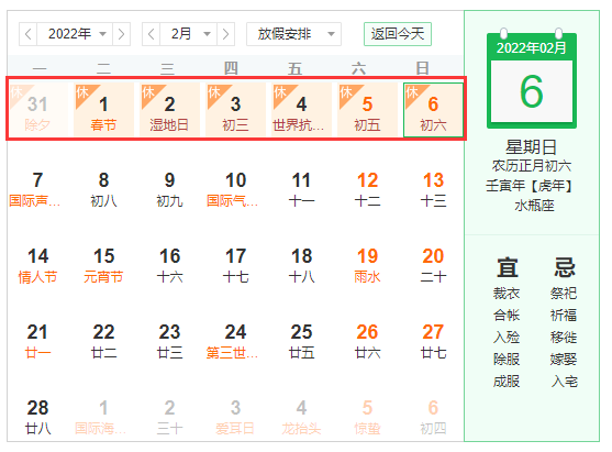 2022年1月(yuè)30日(星期天)至2022年2月(yuè)6日(星期天)放假,共8天;2021年2月(yuè)7日(星期一)上班。